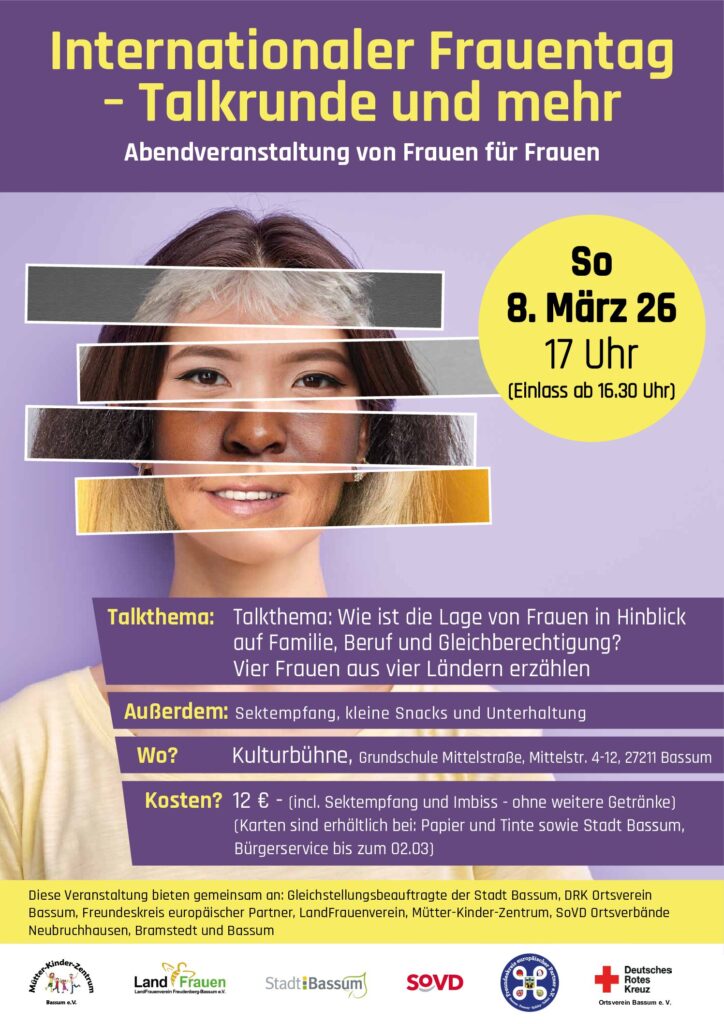 Ein Abend von Frauen für Frauen – mit Sektempfang, Snacks und Unterhaltung Am 8. März steht der Internationale Frauentag ins Haus. Er ist in vielen Ländern ein Tag der Freude und auch in Bassum wollen Vereine, Verbände und die Gleichstellungsbeauftragte der Stadt bisherige Errungenschaften feiern. Eingeladen sind vier Frauen aus verschiedenen Ländern, die von sich […]